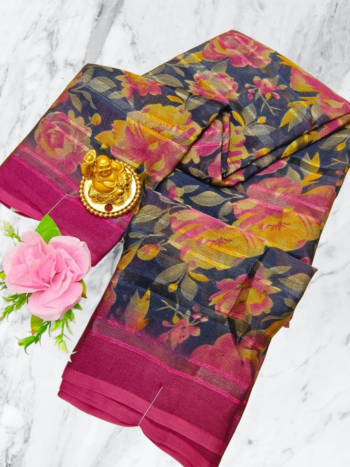 Lightweight crystal silk saree with digital print and 3D effect. Stylish and budget-friendly.