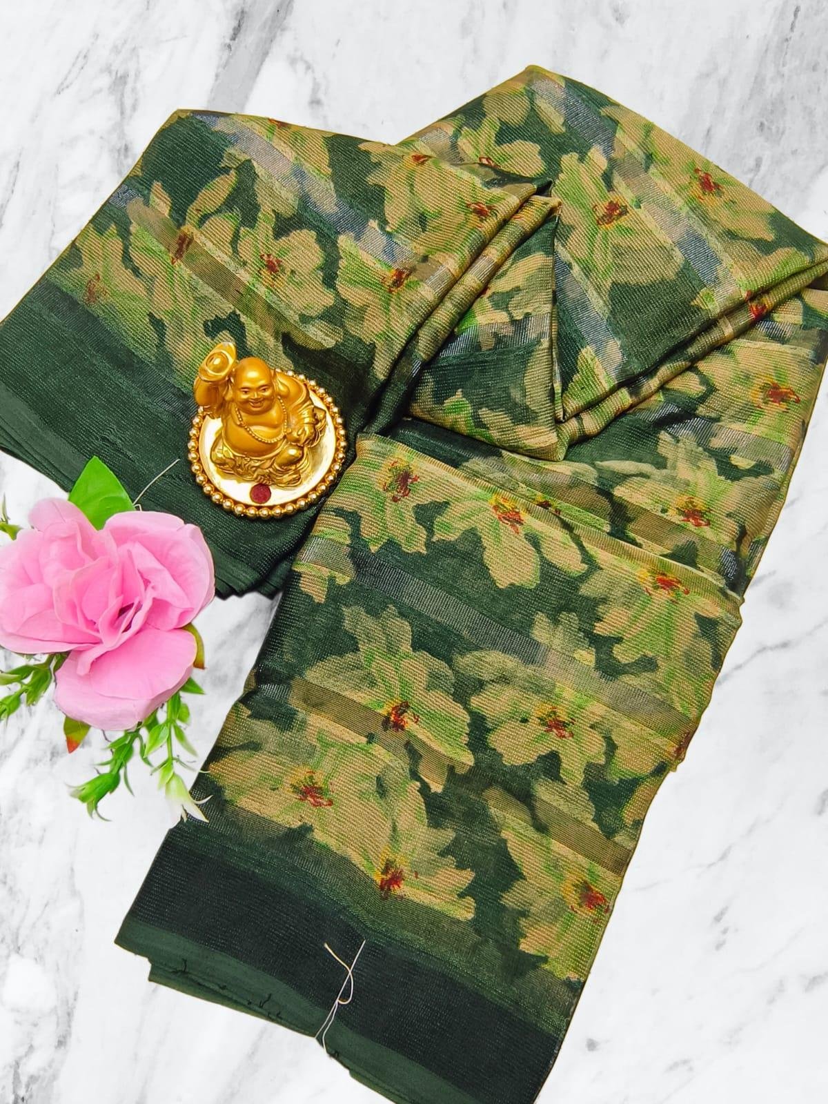 Lightweight crystal silk saree with digital print and 3D effect. Stylish and budget-friendly.