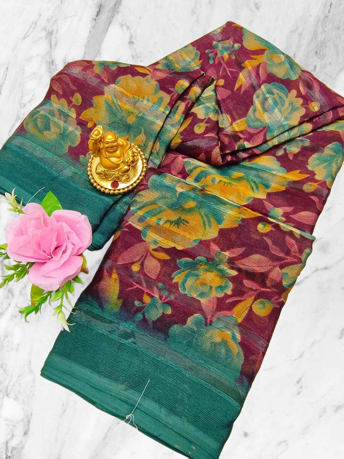 Lightweight crystal silk saree with digital print and 3D effect. Stylish and budget-friendly.