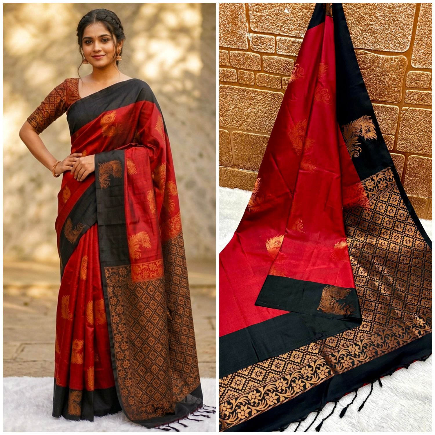 Elegant silk saree with contrast border and grand motif weaving. Lightweight and festive-ready.