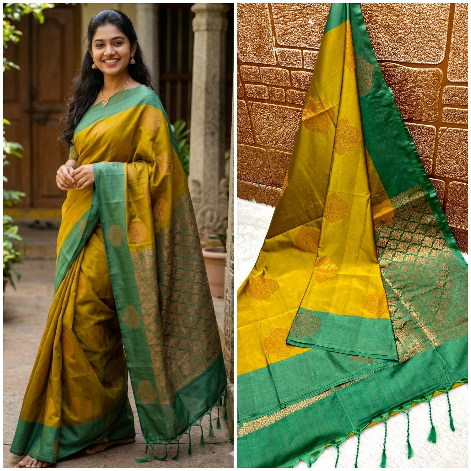 Elegant silk saree with contrast border and grand motif weaving. Lightweight and festive-ready.