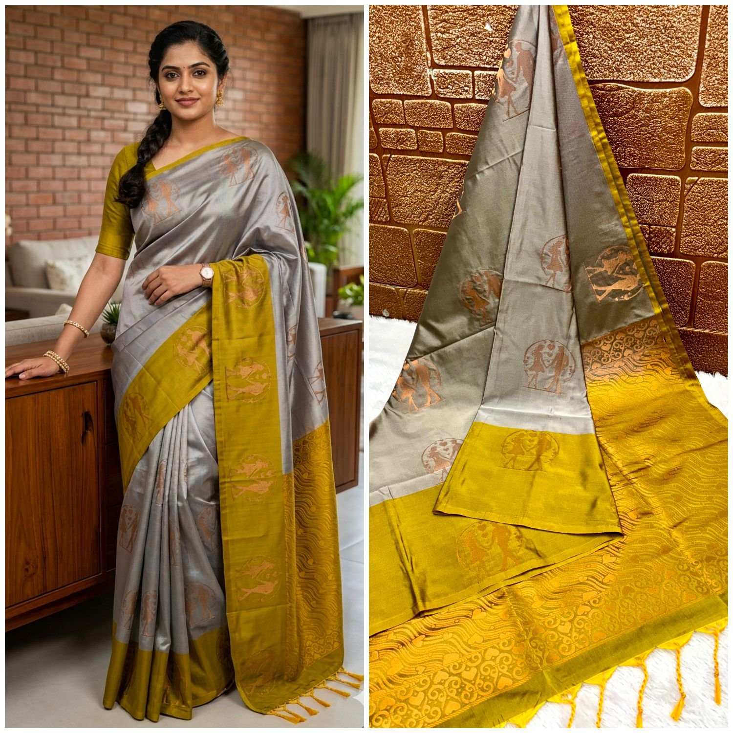 Discover refined tradition with TAROHAA’s Elampillai Elite Silk Saree featuring contrast borders and grand motif weaving across the body.