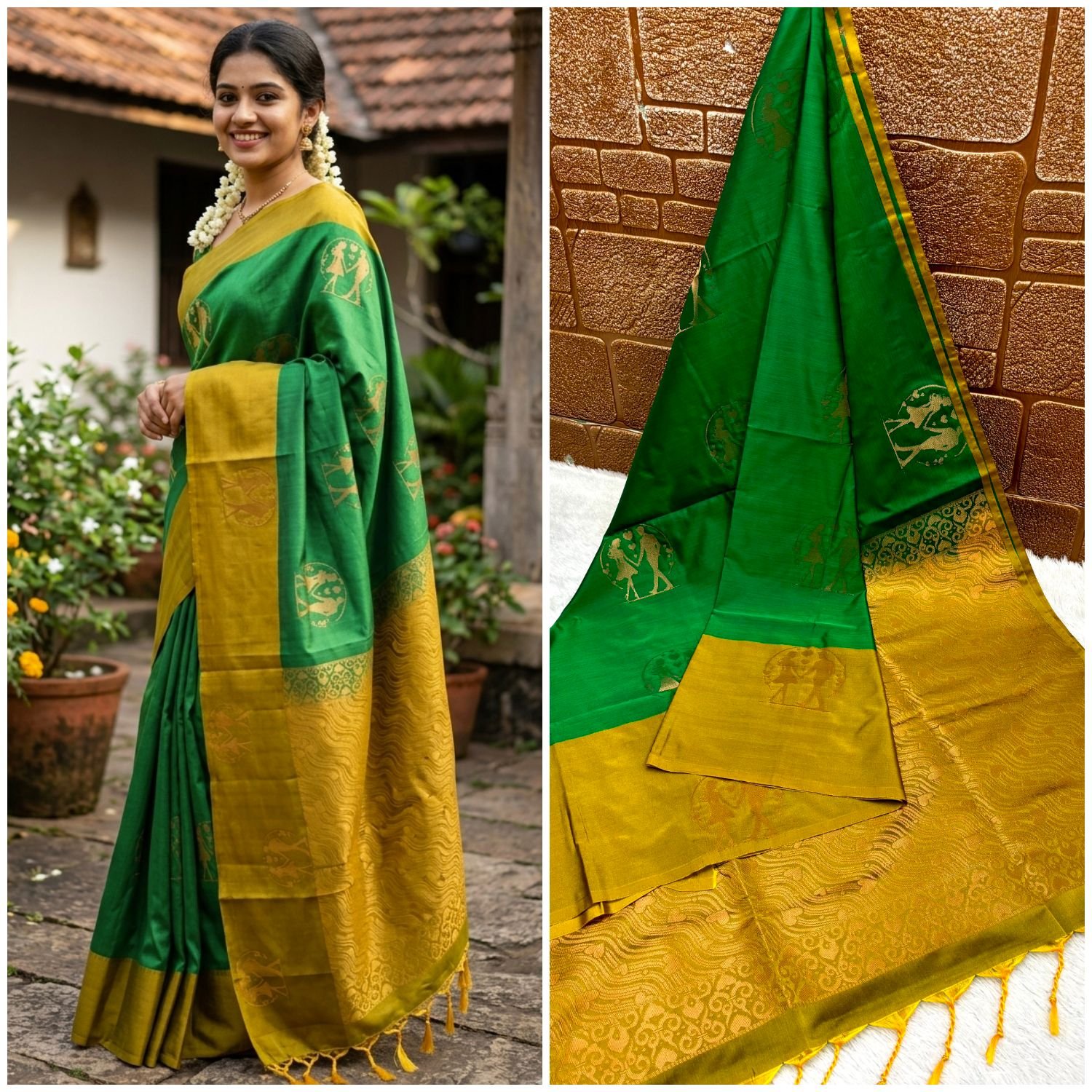 Elegant silk saree with contrast border and grand motif weaving. Lightweight and festive-ready.