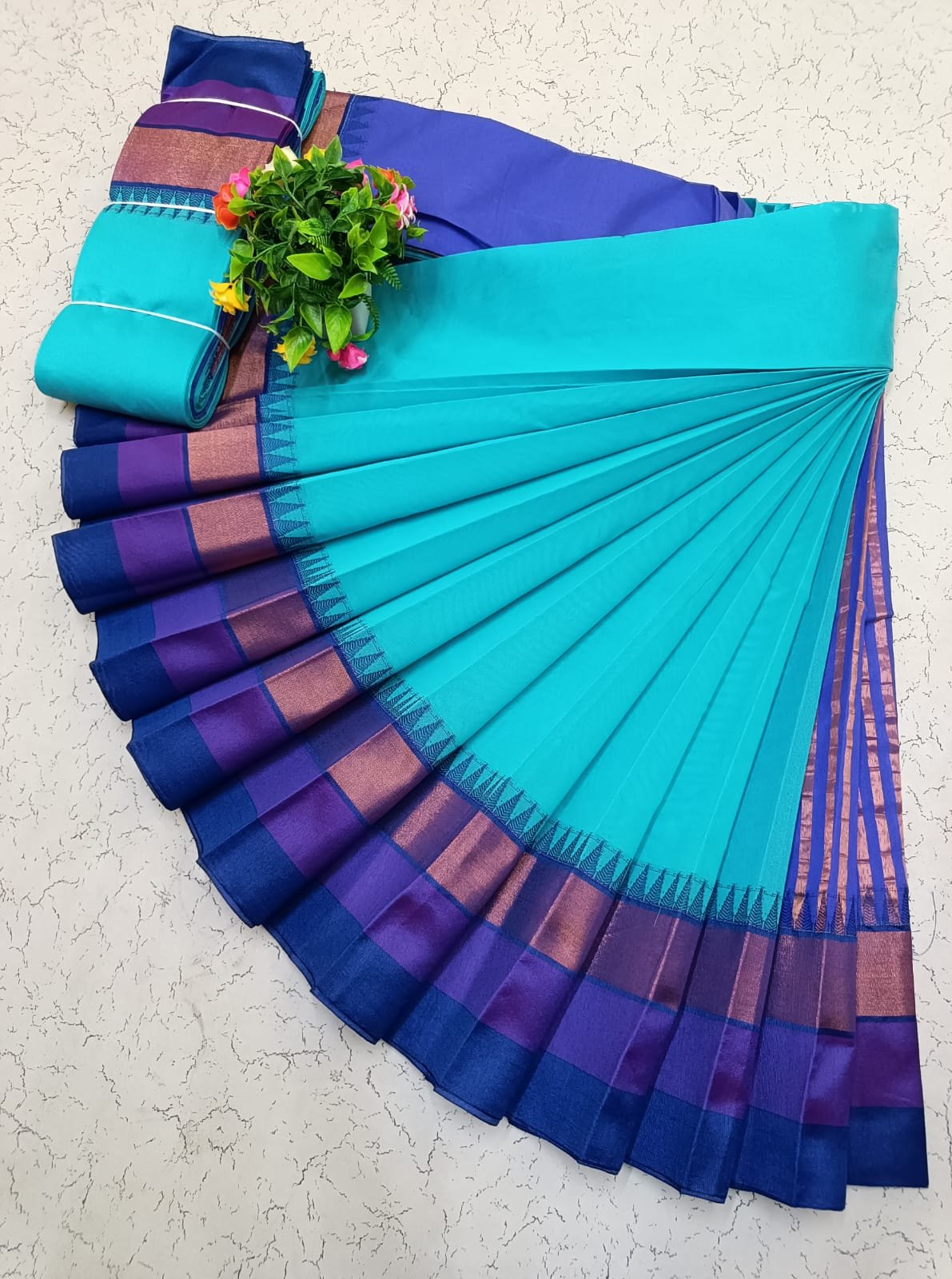 Silk cotton saree with korvai border and contrast pallu. Soft and lightweight.
