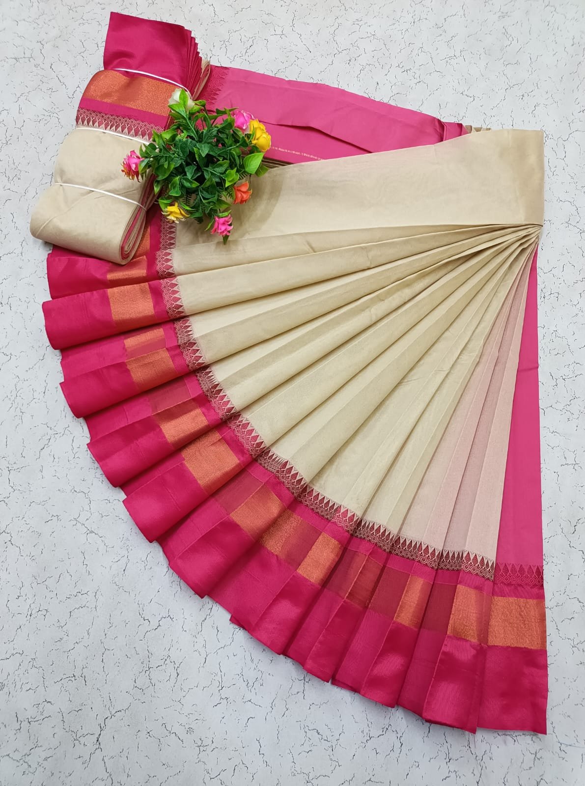 Silk cotton saree with korvai border and contrast pallu. Soft and lightweight.
