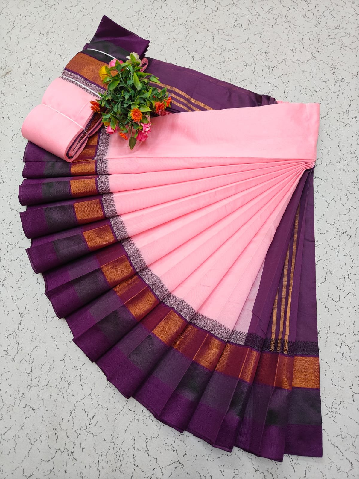 Silk cotton saree with korvai border and contrast pallu. Soft and lightweight.