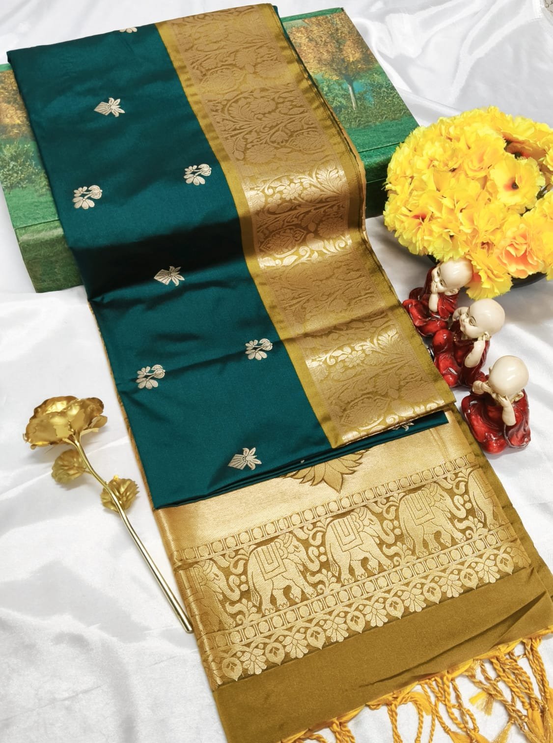 Premium soft silk saree with grand pallu and all-over fancy puttas. Rich, elegant, and perfect for occasions.