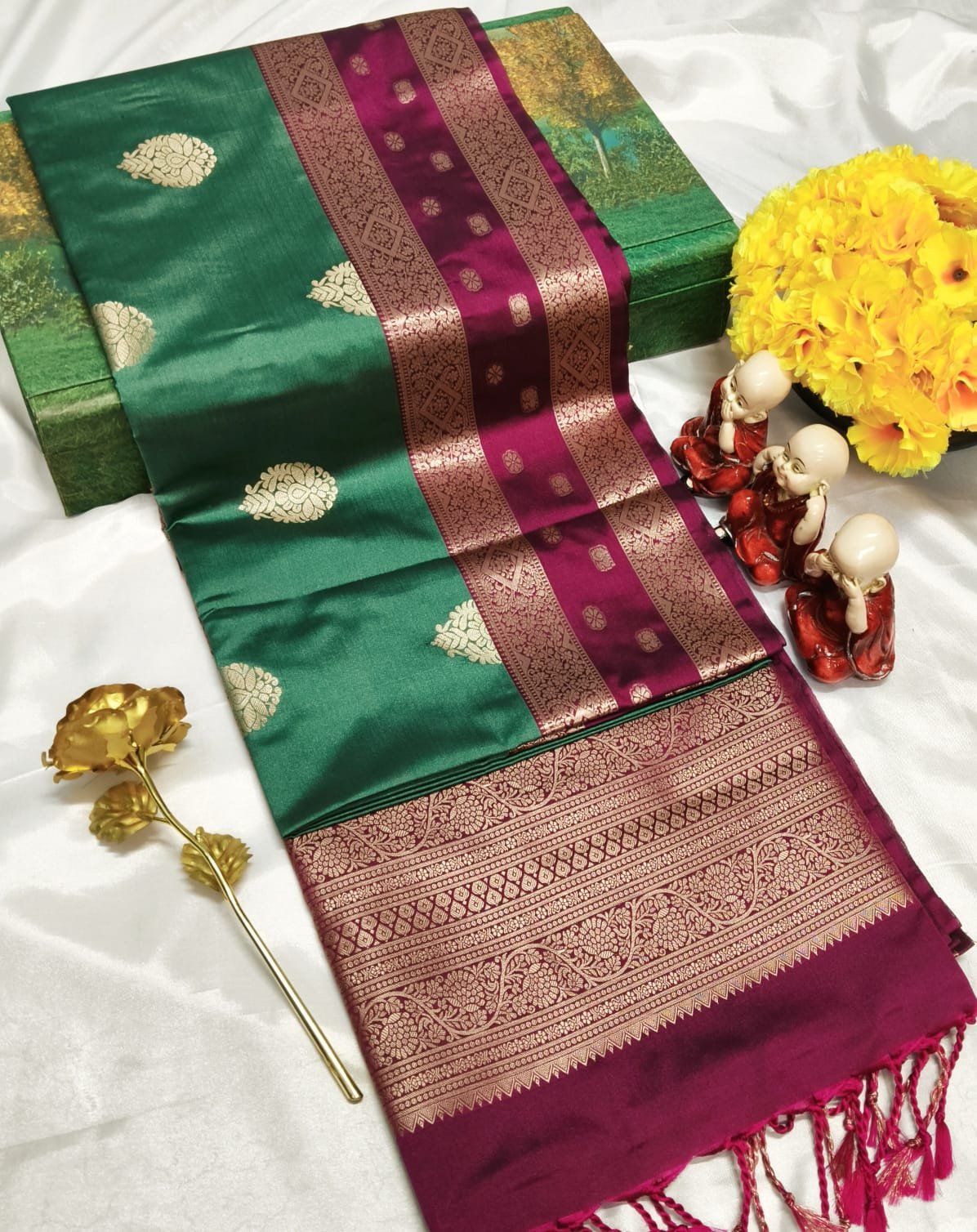 Premium soft silk saree with grand pallu and all-over fancy puttas. Rich, elegant, and perfect for occasions.