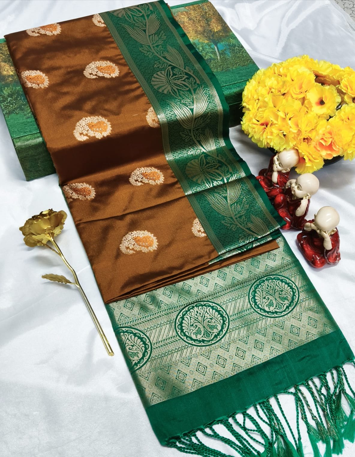Premium soft silk saree with grand pallu and all-over fancy puttas. Rich, elegant, and perfect for occasions.