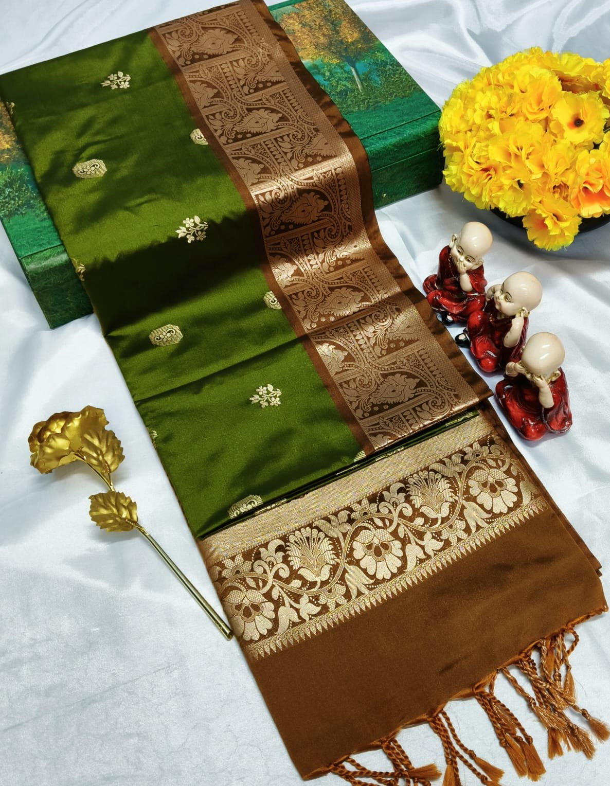 Premium soft silk saree with grand pallu and all-over fancy puttas. Rich, elegant, and perfect for occasions.