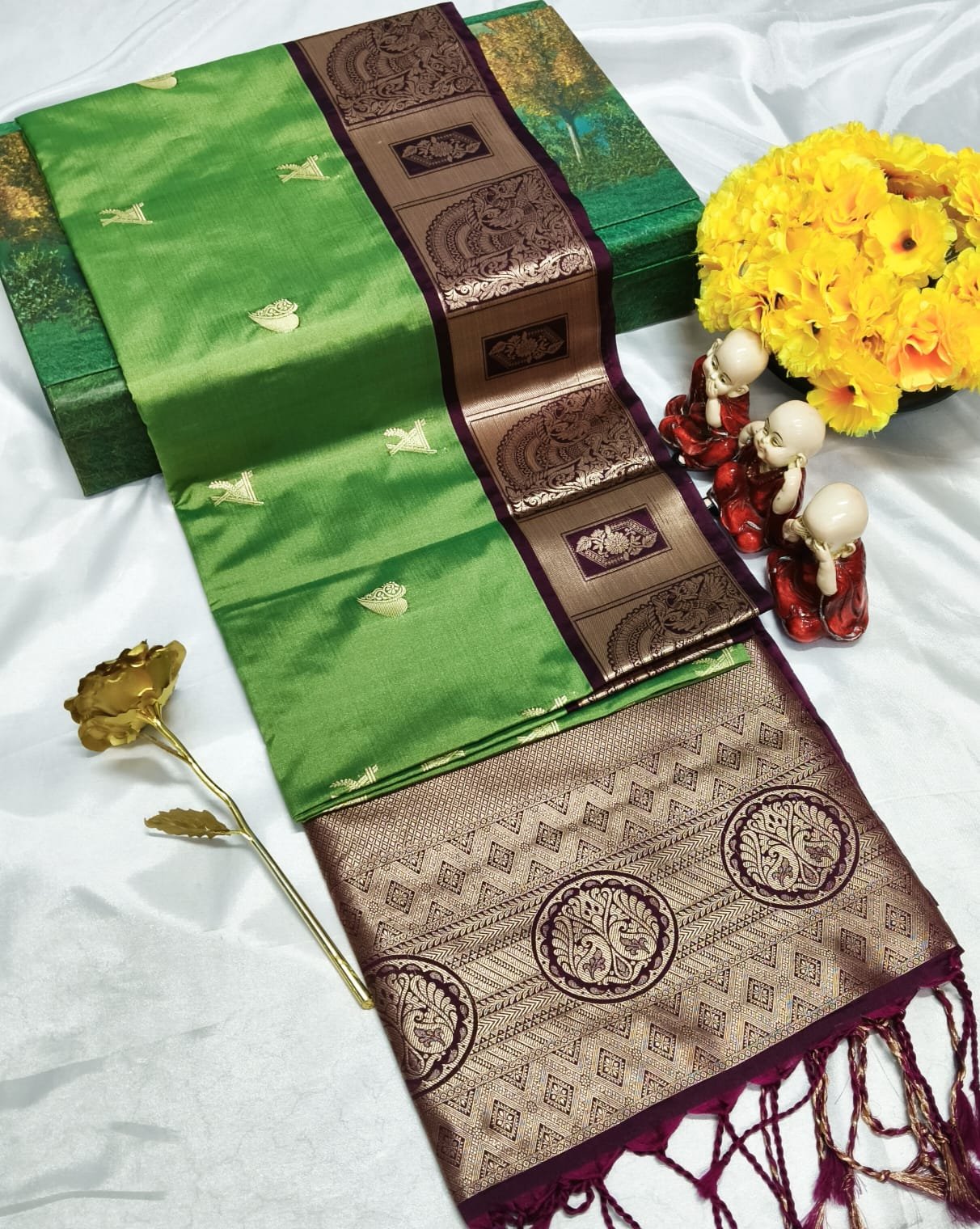 Premium soft silk saree with grand pallu and all-over fancy puttas. Rich, elegant, and perfect for occasions.