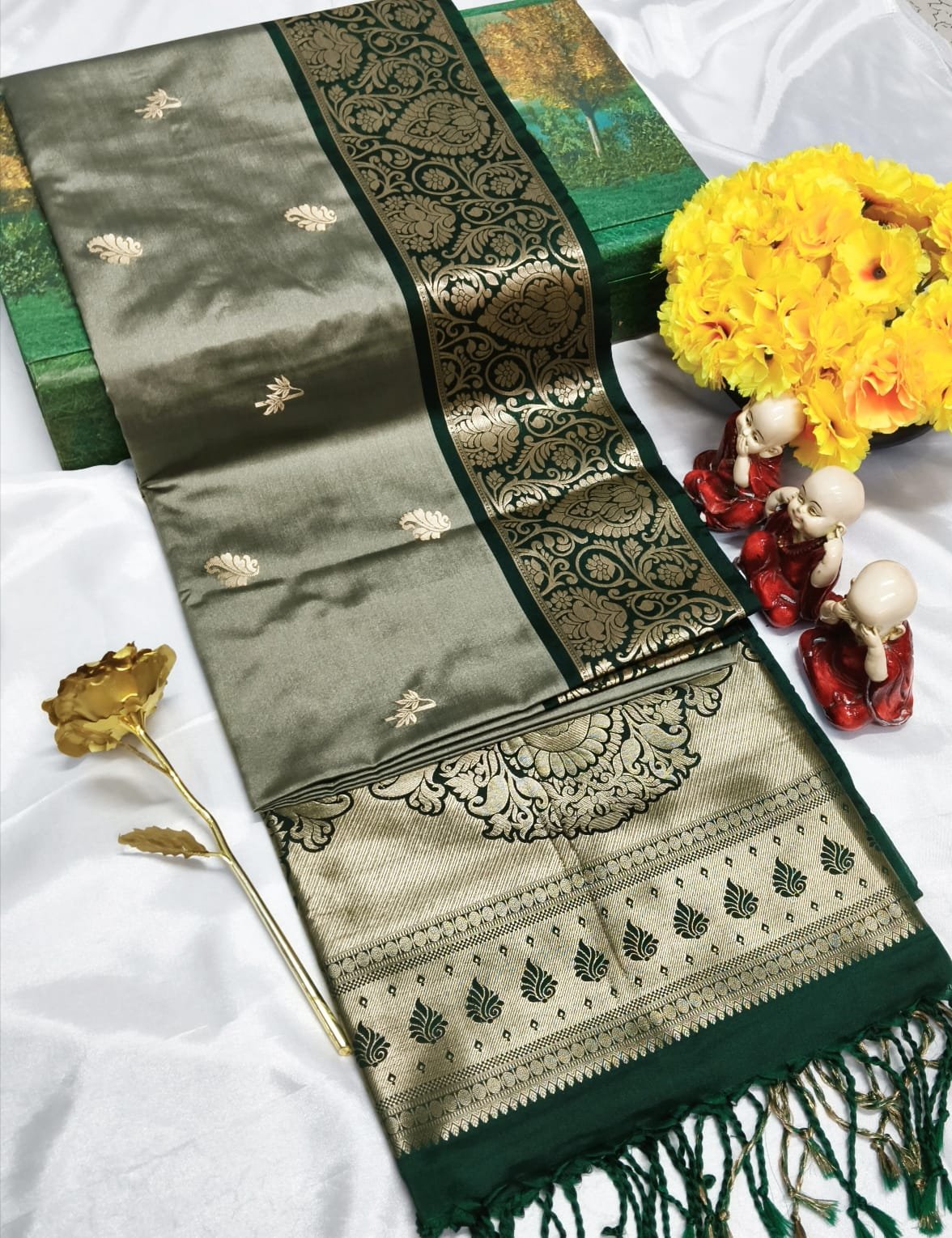 Premium soft silk saree with grand pallu and all-over fancy puttas. Rich, elegant, and perfect for occasions.