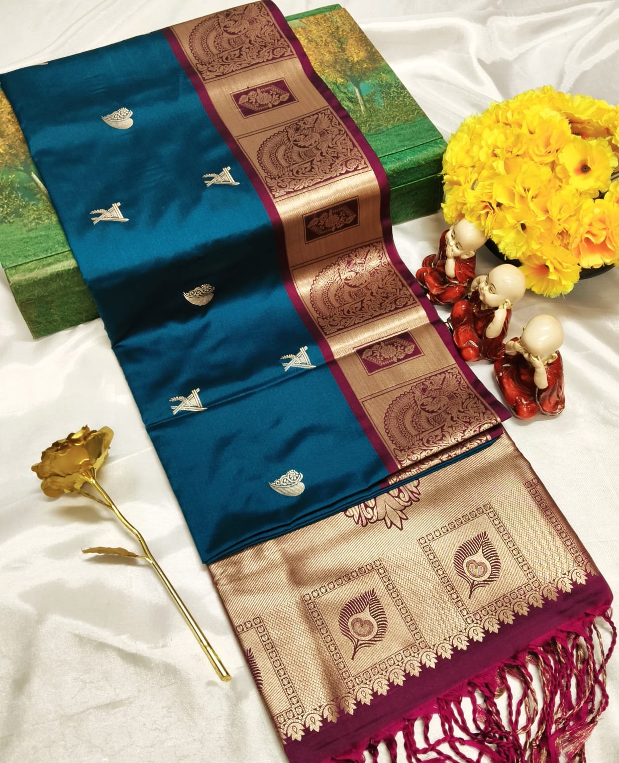 Premium soft silk saree with grand pallu and all-over fancy puttas. Rich, elegant, and perfect for occasions.