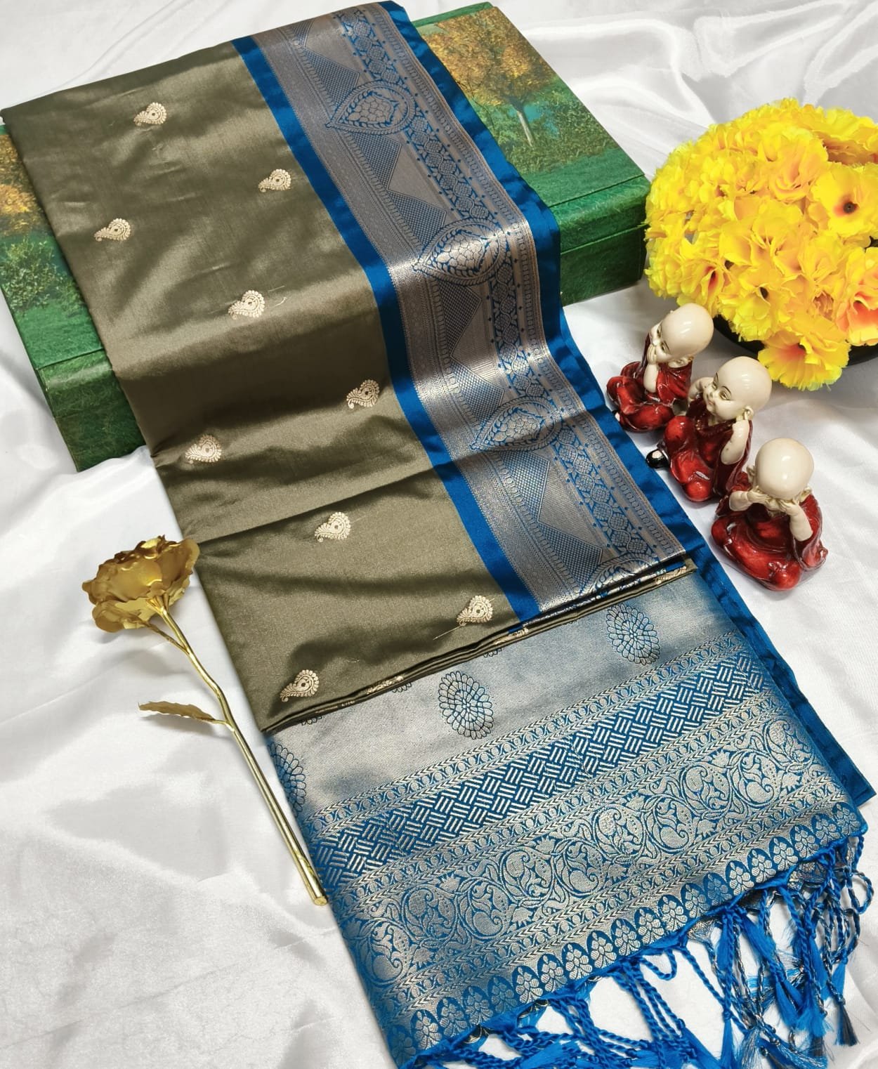Premium soft silk saree with grand pallu and all-over fancy puttas. Rich, elegant, and perfect for occasions.