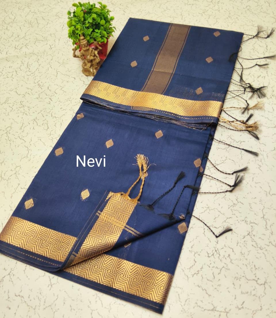 Maheswari silk cotton saree with Tasar zari diamond border. Lightweight and elegant.