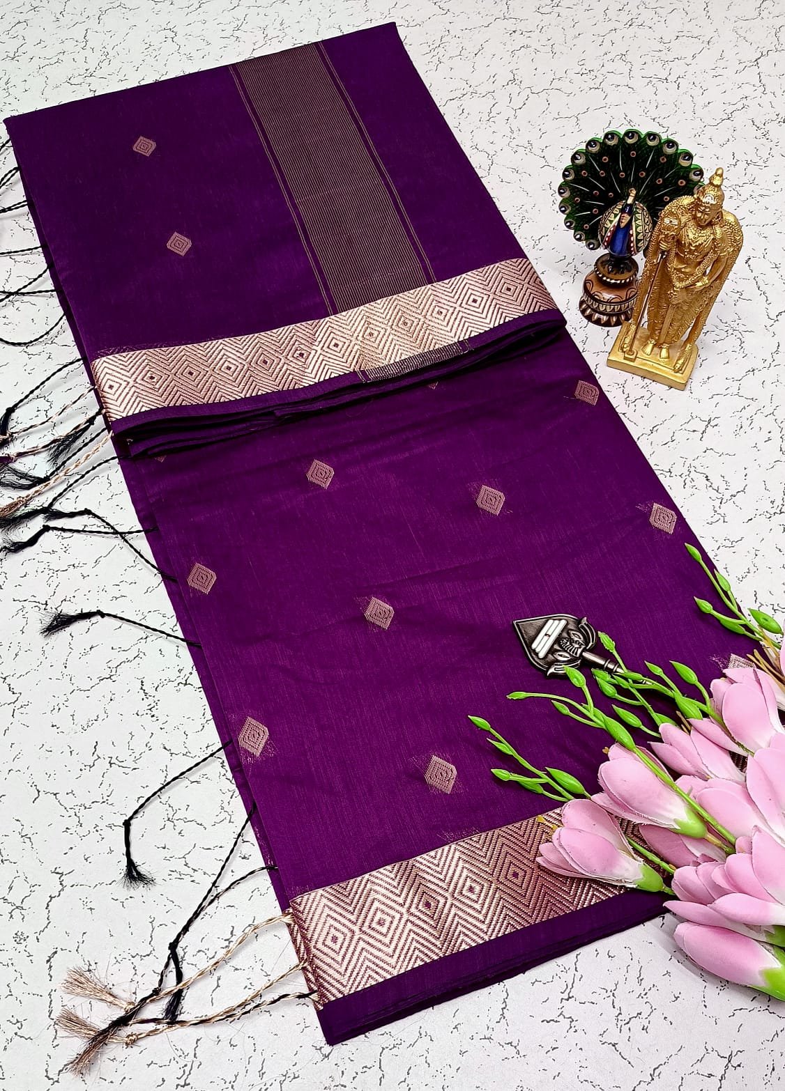 Elevate your ethnic wardrobe with this exquisite Maheswari Silk Cotton saree from TAROHAA, featuring a rich violet tone and elegant Tasar zari diamond border. Crafted for comfort and timeless appeal.