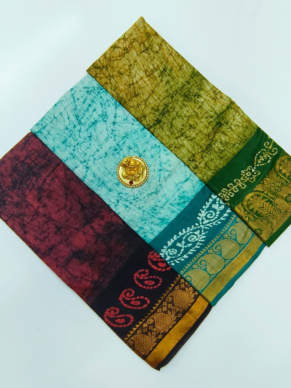 Lightweight pure cotton saree with Baadhani print and contrast border. Ideal for summer and daily wear.