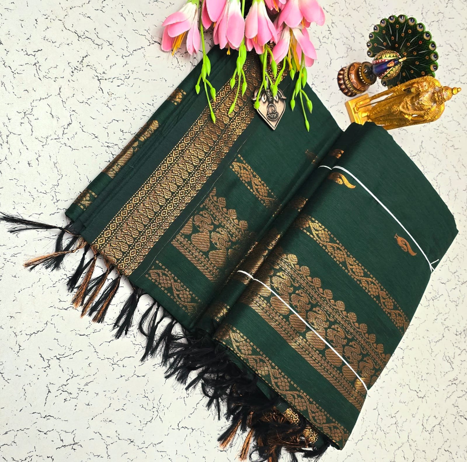 Silk cotton saree with thread puttas and rich zari pallu. Soft, lightweight, and elegant.