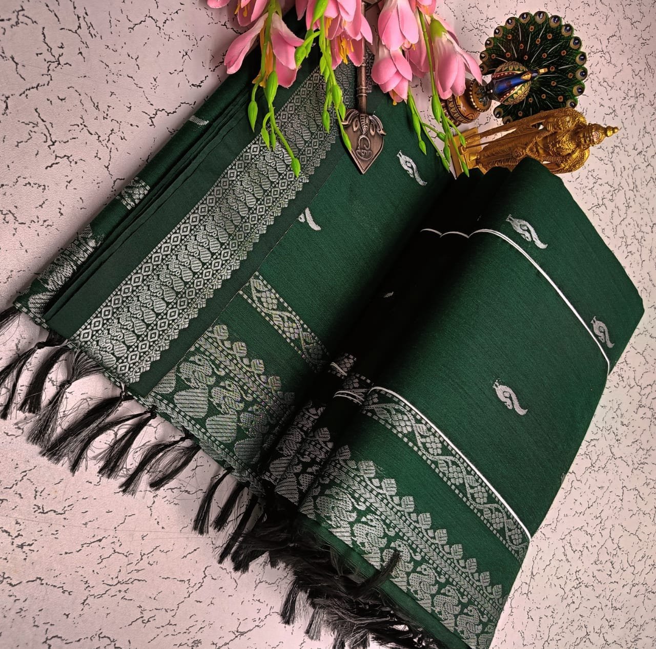 Silk cotton saree with thread puttas and rich zari pallu. Soft, lightweight, and elegant.