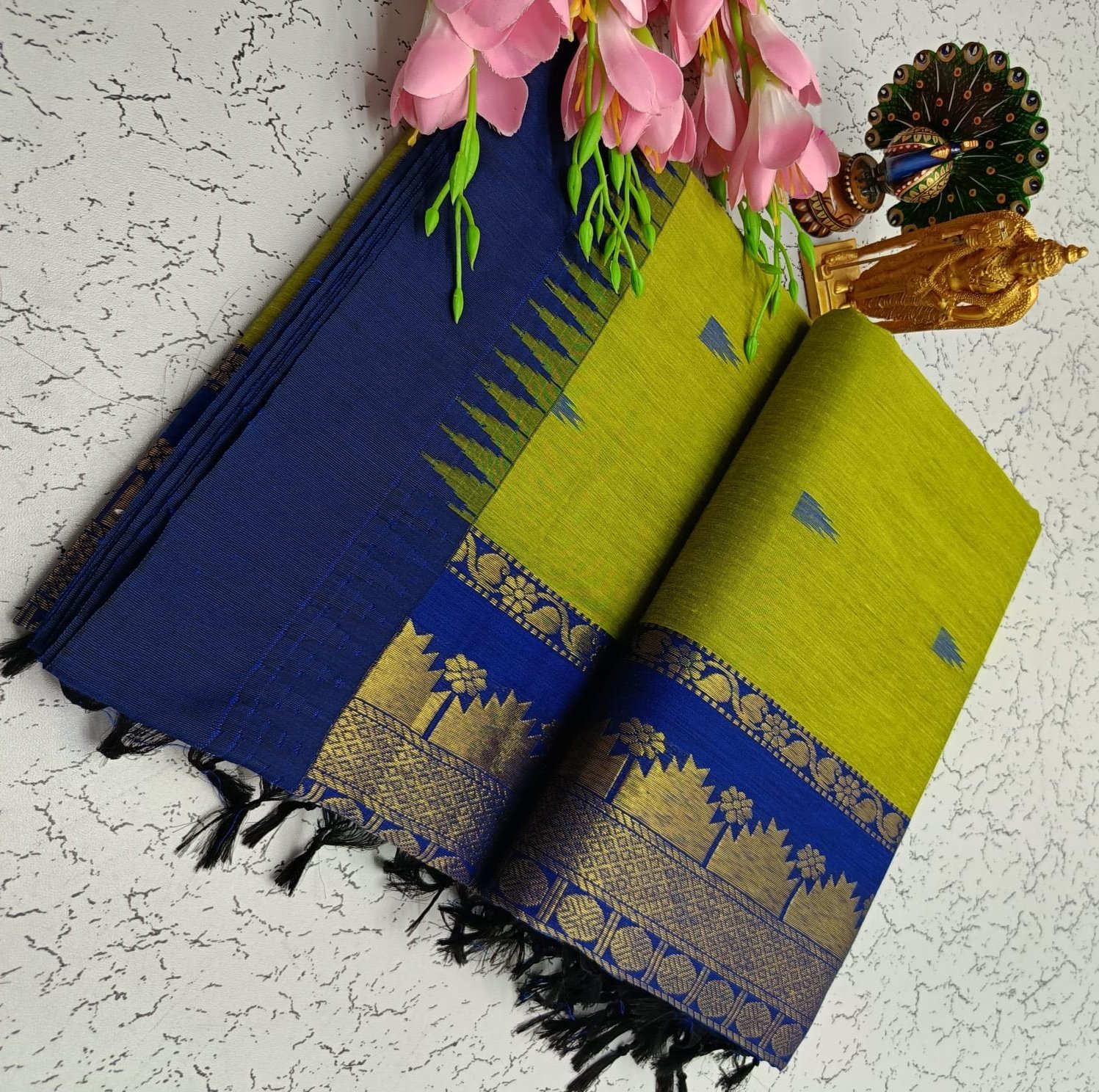 Silk cotton saree with thread puttas and rich zari pallu. Soft, lightweight, and elegant.