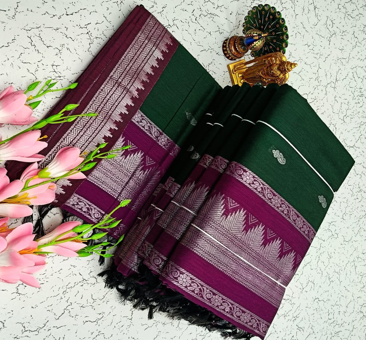 Silk cotton saree with thread puttas and rich zari pallu. Soft, lightweight, and elegant.