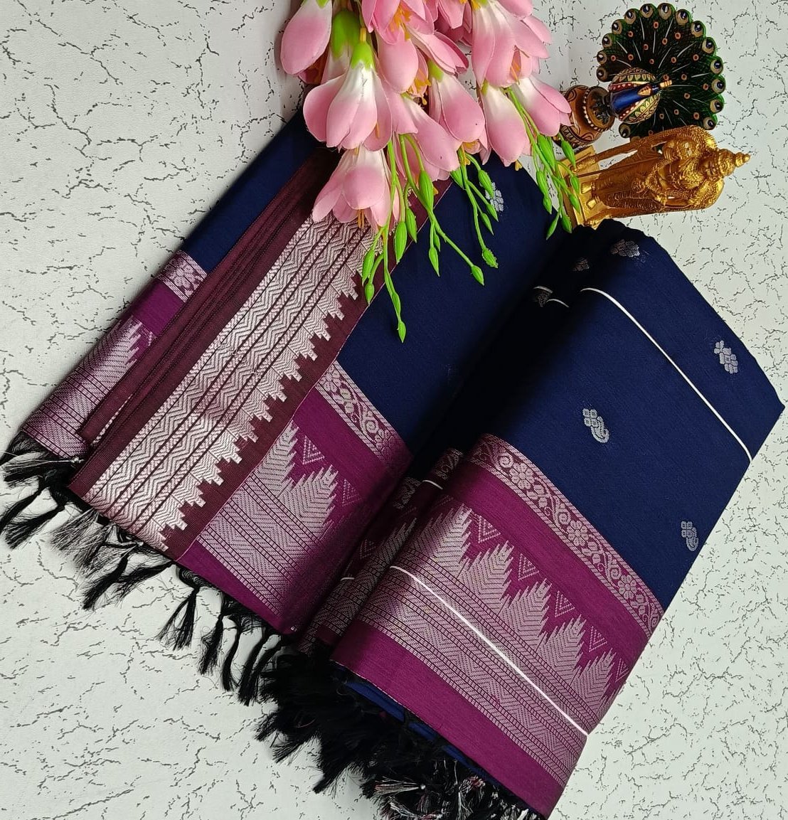 Silk cotton saree with thread puttas and rich zari pallu. Soft, lightweight, and elegant.