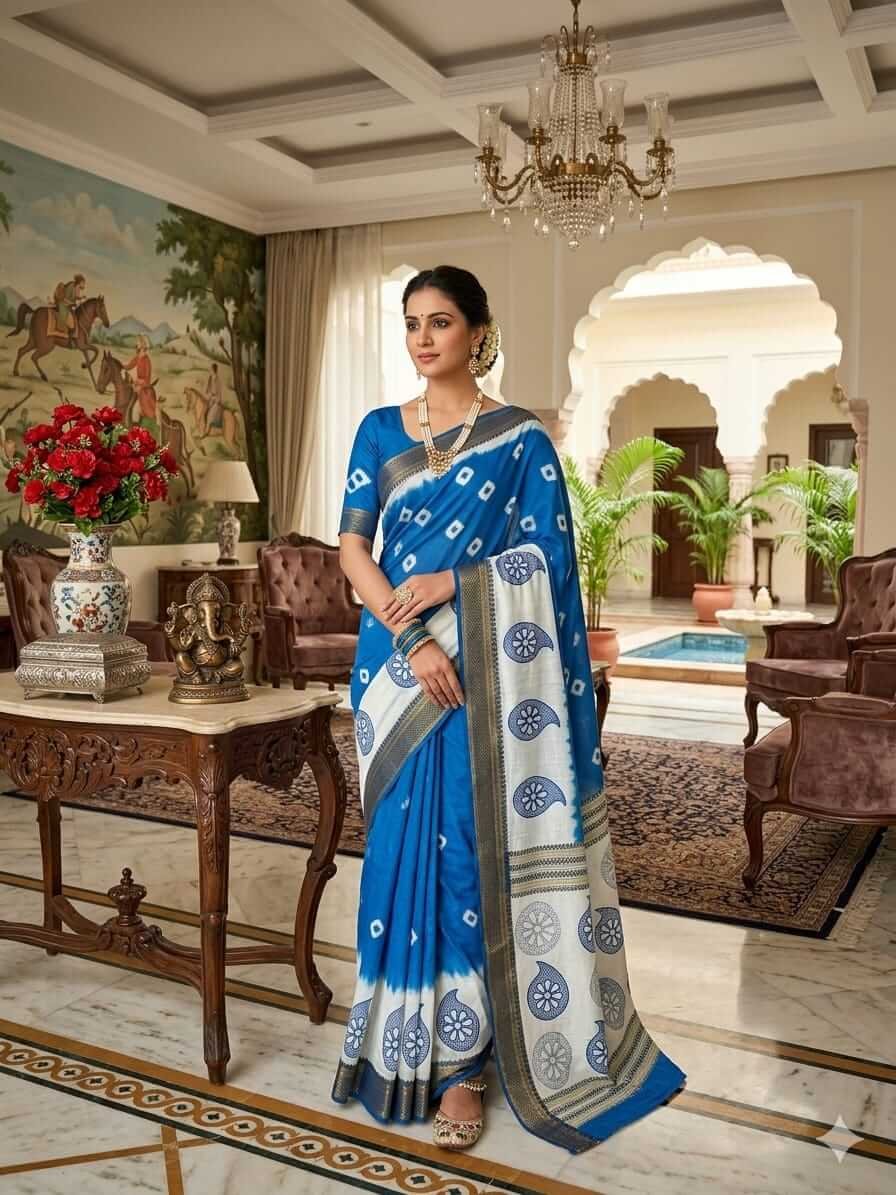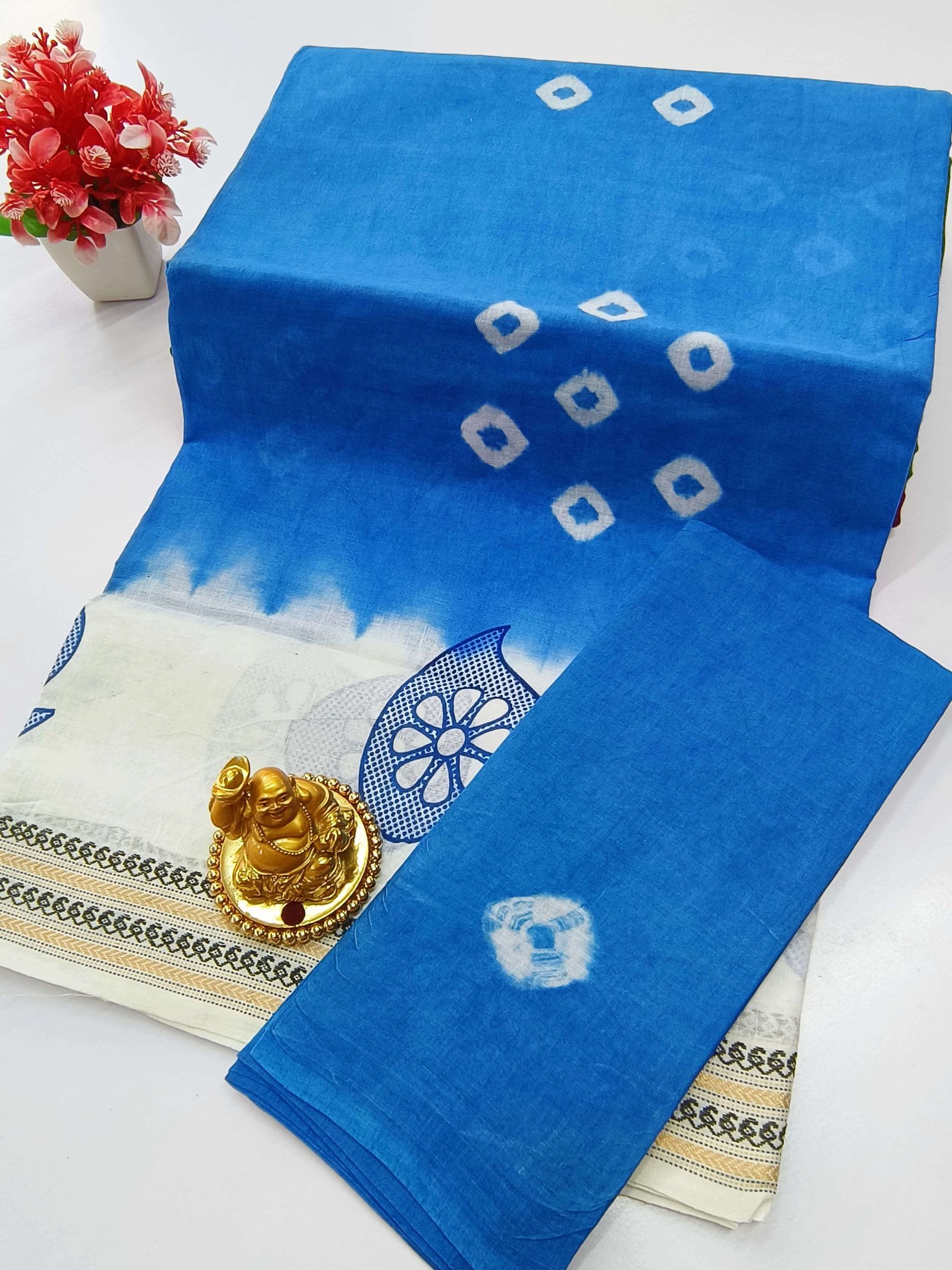 Premium Baandhani pure cotton saree with breathable fabric, contrast border, lightweight feel, perfect for summer and daily wear. Saree length 5.5m with blouse.