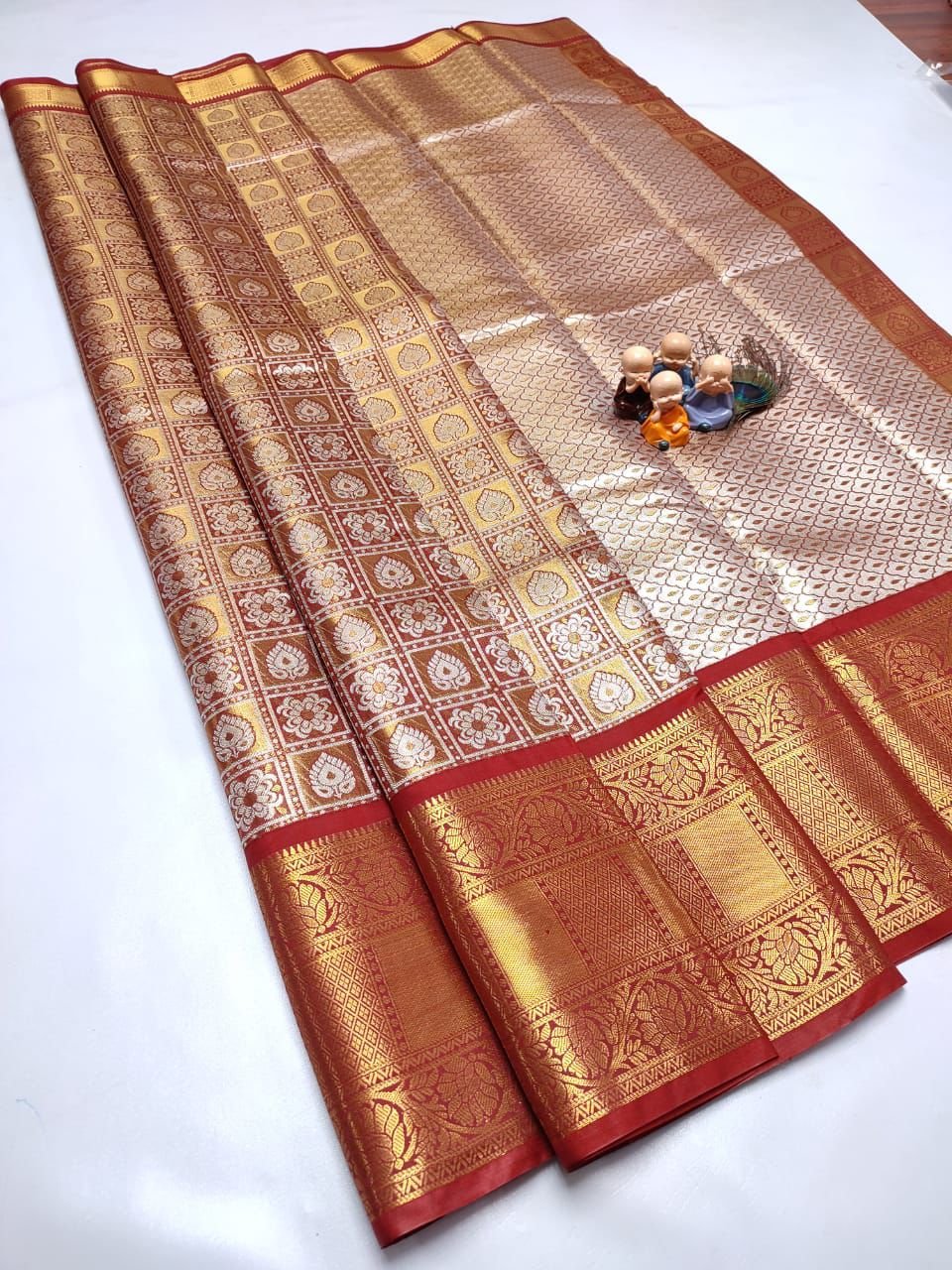 Grand tissue silk saree with Kanchipuram brocade and rich zari pallu. Perfect for bridal and festive wear.